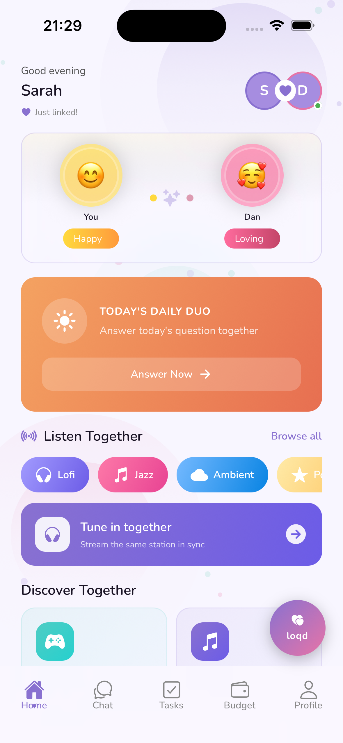loqd brings couples closer with mood sharing, secure messaging, shared tasks, budget tools, AI insights, and music — all in one private, beautiful app.